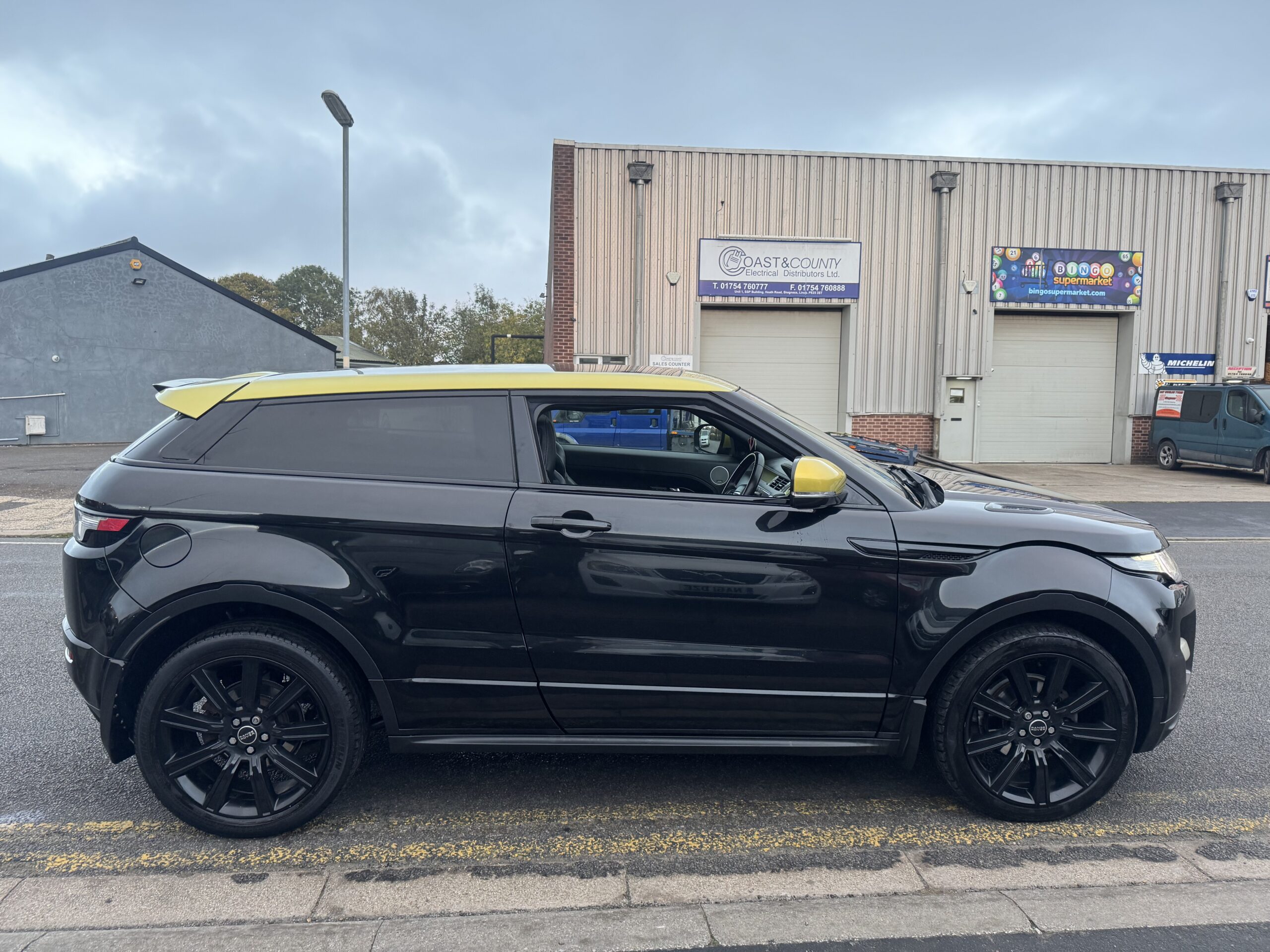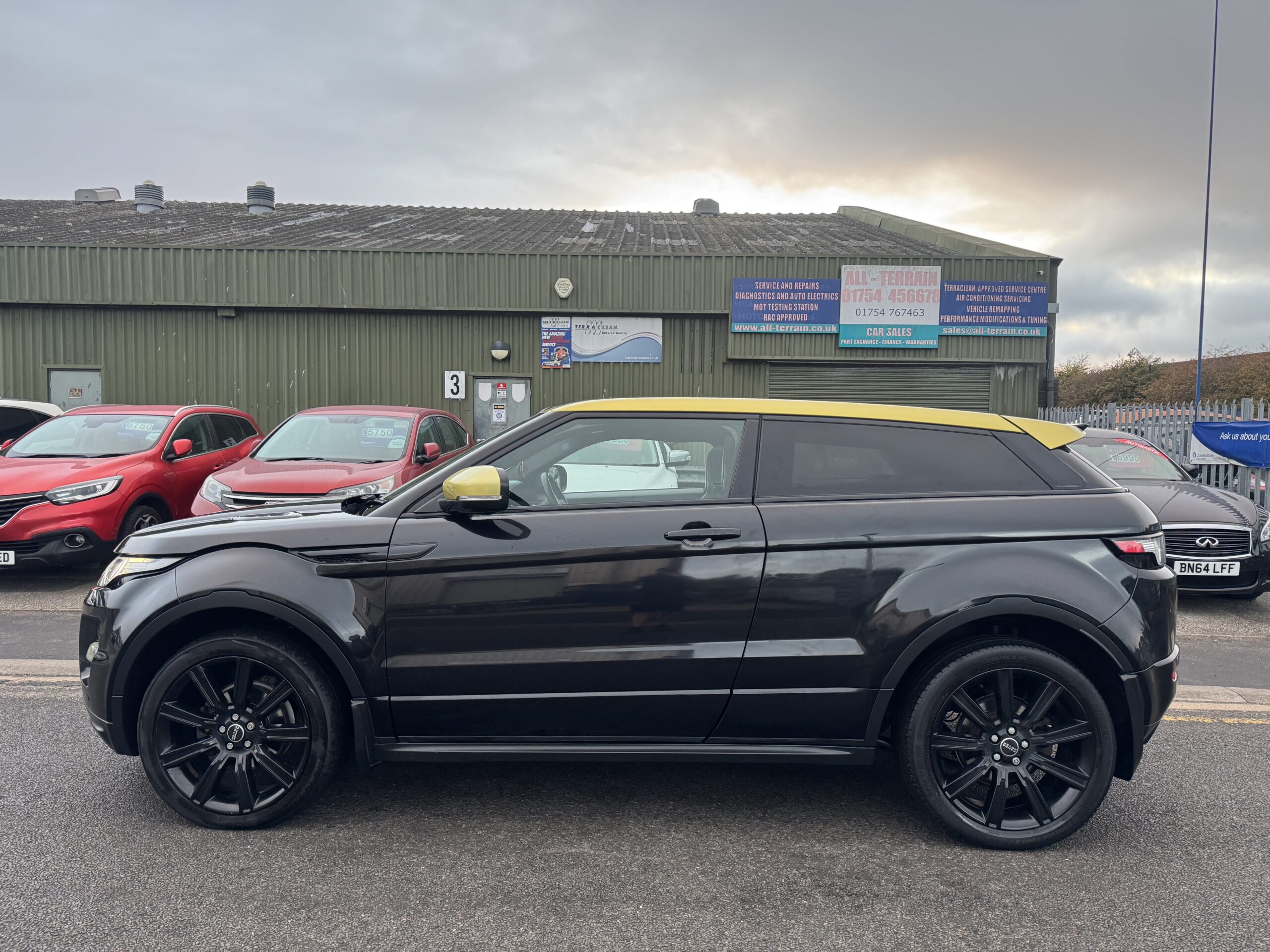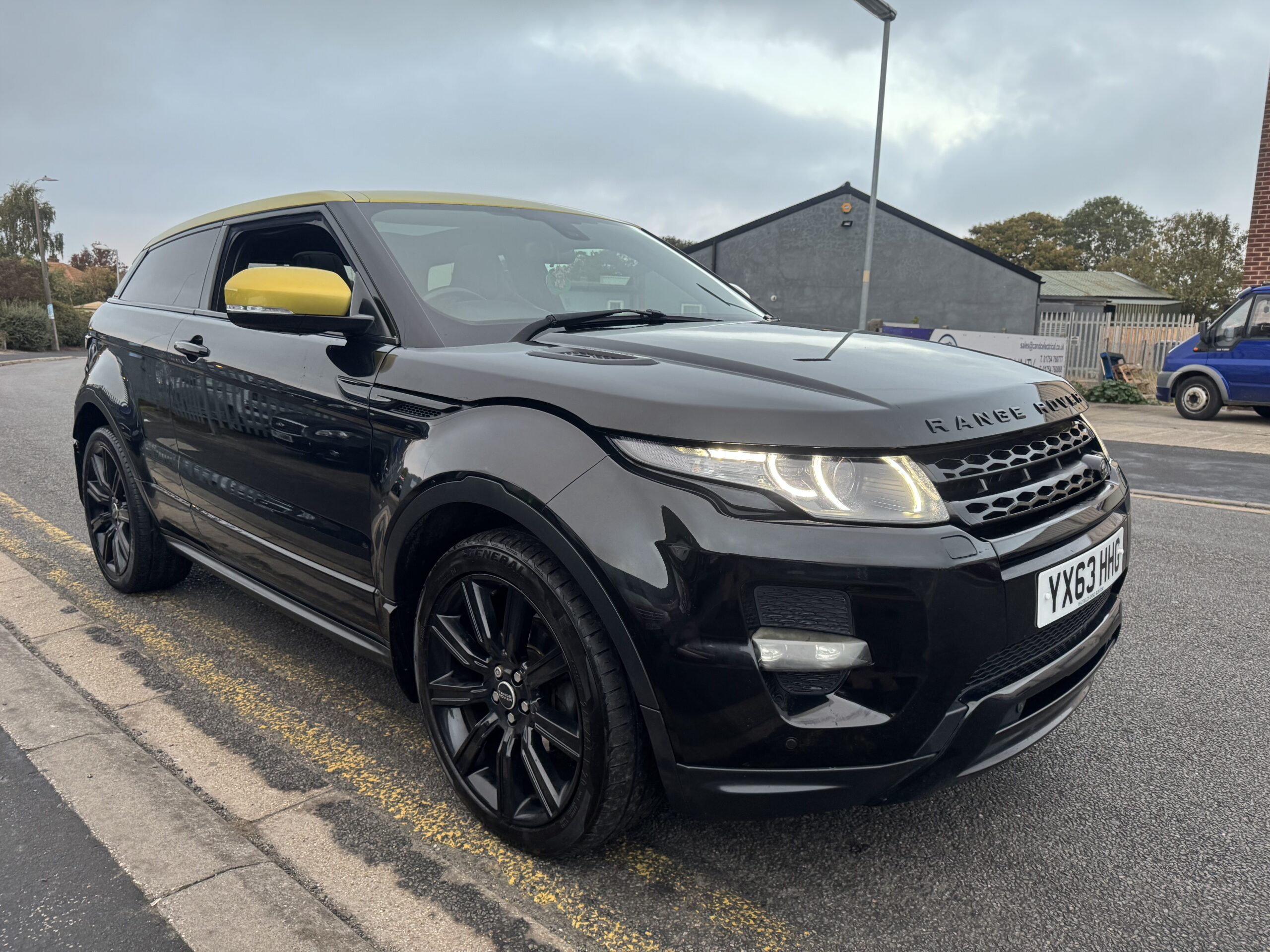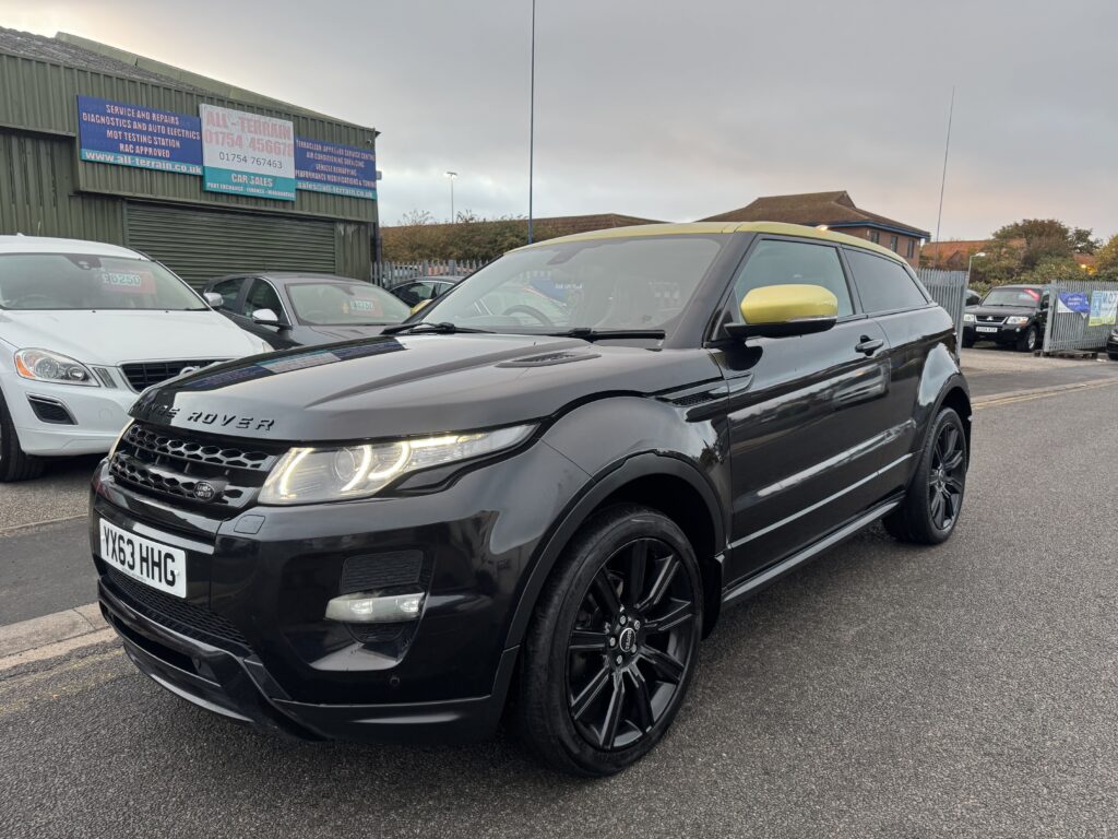 2013 (63) LAND ROVER RANGE ROVER EVOQUE 2.2 SD4 Special Edition 3dr Automatic in Santorini Black paint with Sicilian yellow contrast roof. Very rare coupe giving the already stylish Evoque a sleeker appearance. This example cost over £48,000 new which makes it one of the most expensive Evoques you could have purchased due to it being the more expensive coupe model and the special edition which ticked nearly every optional extra. This includes 20 inch alloy wheels, Black exterior pack, Meridian sound system, 8 inch touchscreen infotainment, Panoramic roof, Premium navigation, Electric leather wing-back styled seats, Reverse camera, Power folding tailgate, Terrain driving modes, Bluetooth, Cruise control, Tow bar with twin electrics, Sport mode with paddle shifters and more. August 2026 MOT, Service and 6 Months Warranty with the sale. A very rare opportunity to own a Special Edition Evoque Coupe. Very good service history, full service completed February 2025. Finance Available.